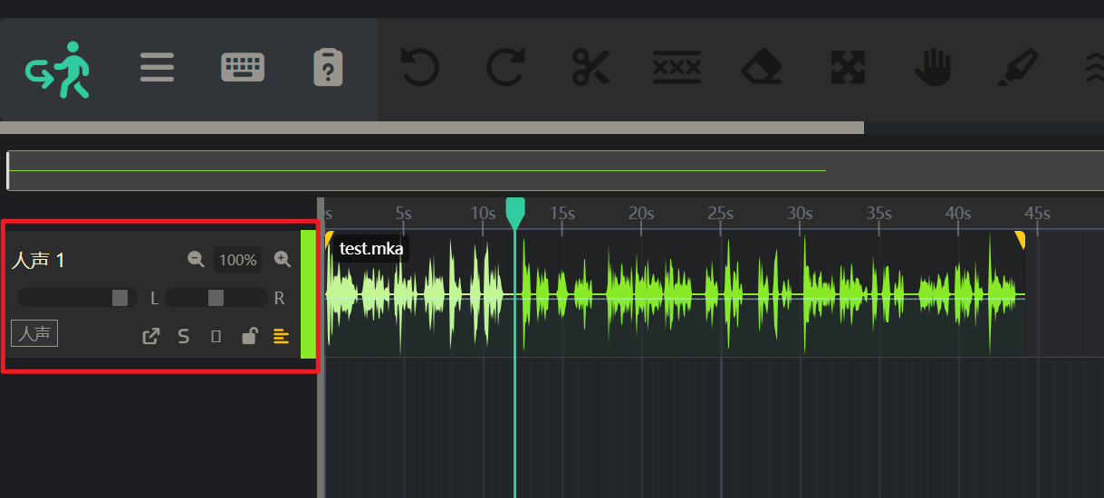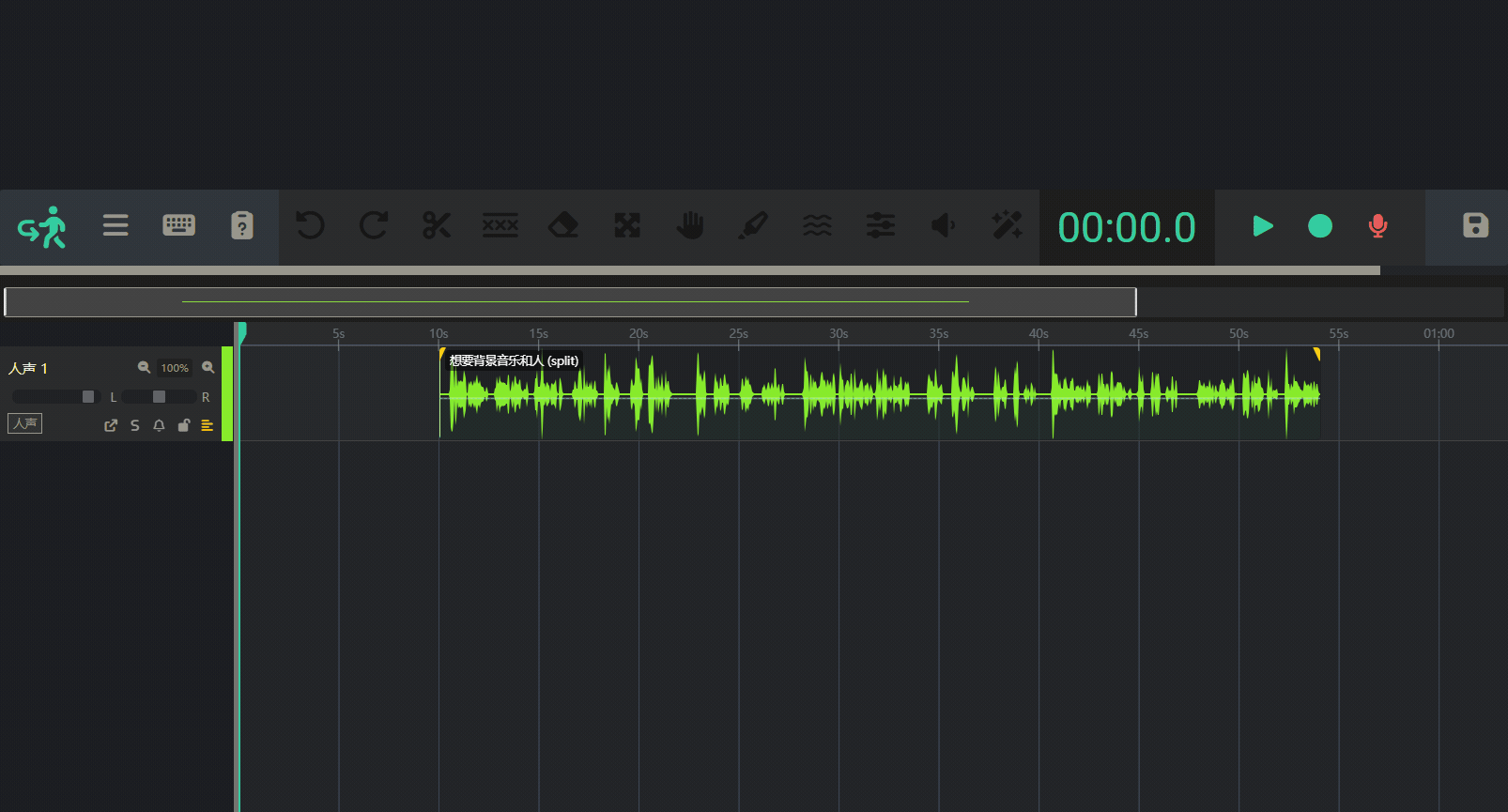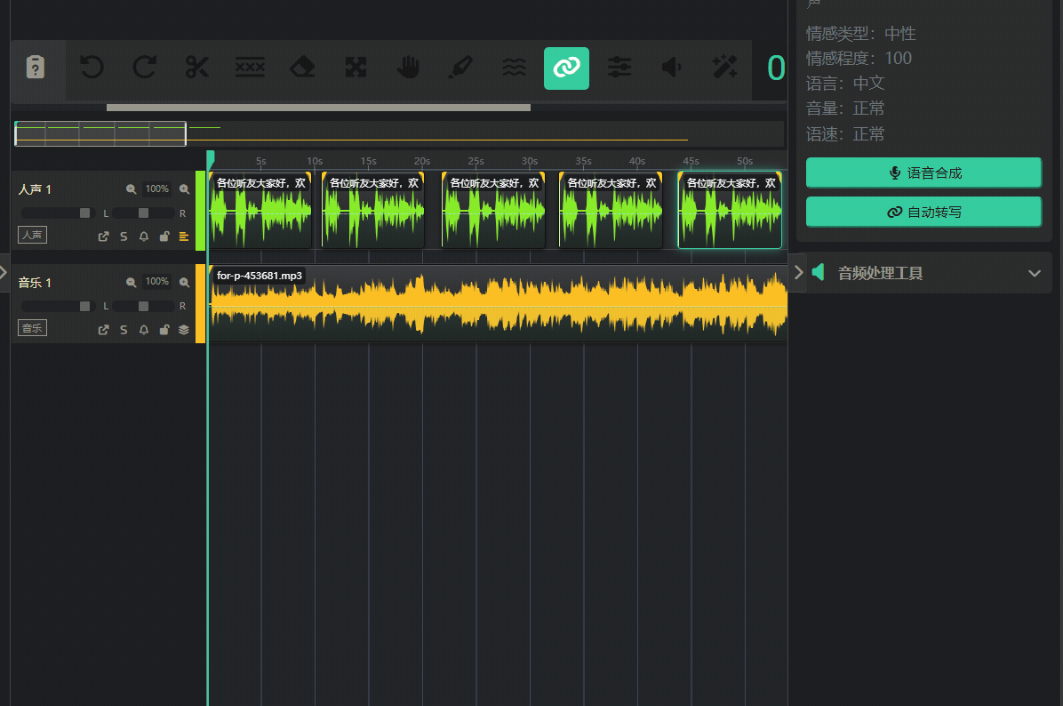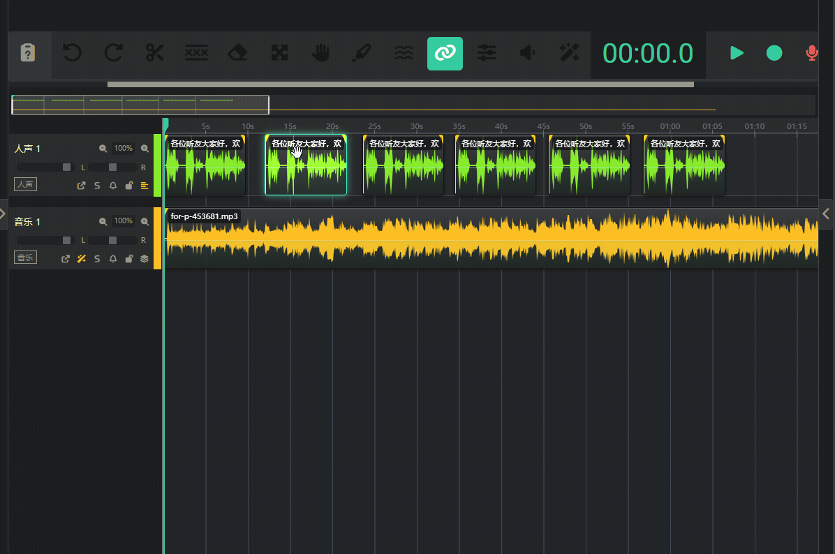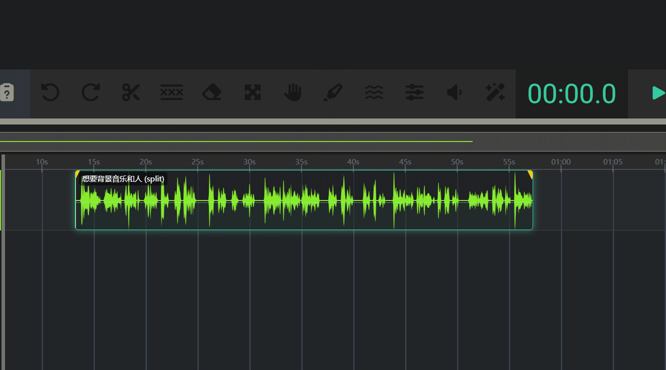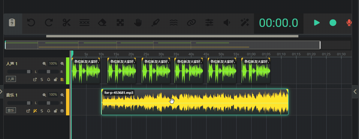 - 多轨时间线 (下方): 这是一个专业的多音轨视图。您可以在这里看到所有音频的波形,并通过拖拽、裁剪、分割等方式对音频进行精细操作。最上方是一排工具栏,提供各种音频操作功能,播放、暂停、调整时间等都在这里完成。
