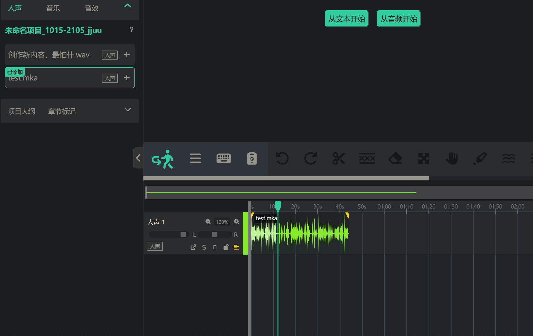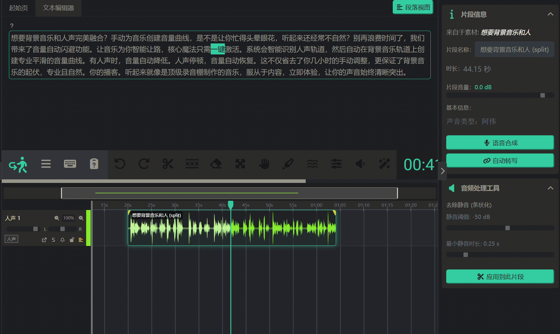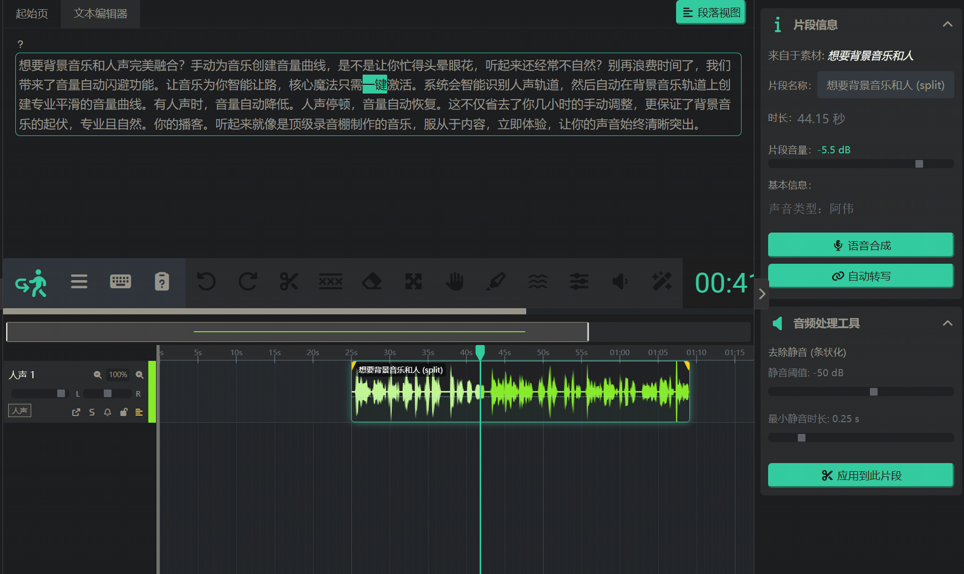 - 您可以把文本编辑器想象成一个“智能脚本”,其中的每一个字都像被赋予了GPS定位一样,精准地与下方时间线上的对应声音波形关联。 理解这一点,您就能真正体验到应用的强大之处:点击文本可以直接定位到音频中的相应位置! 这是实现“通过编辑文字来剪辑音频”的基础。